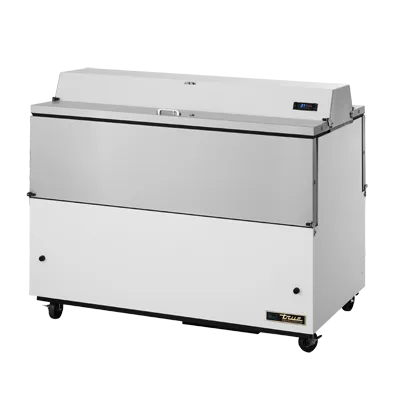 Enhance the heart of your restaurant with the True Manufacturing TMC-58-DS-SS-HC Milk Cooler / Station. This mobile milk cooler is designed to meet the demands of a busy commercial restaurant. With its forced-air system and dual-sided stainless steel drop front/hold-open flip-up lids, it provides easy access and efficient cooling for up to 16 crates of milk. The locks ensure the safety and security of your inventory. The white vinyl exterior and stainless steel interior and floor not only give it a sleek and professional look but also make it easy to clean and maintain. The three heavy-duty floor racks provide ample storage space, while the digital thermometer allows you to monitor the temperature accurately. With its 4" castors, this milk cooler is easy to move around the kitchen. Made in the USA and certified by cULus and UL EPH Classified, you can trust the quality and reliability of True Manufacturing. Upgrade your restaurant's milk storage with the True Manufacturing TMC-58-DS-SS-HC Milk Cooler / Station.