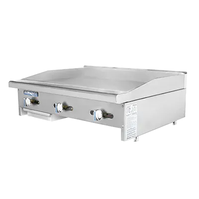 Master the art of flavor with the Turbo Air TAMG-36 Gas Countertop Griddle. This high-quality griddle is designed to meet the demands of a commercial restaurant kitchen. With its stainless steel front and side, built-in splash guard, and highly polished steel griddle plate, this griddle is both durable and easy to clean. The three aluminized U-shaped burners and manual controls ensure precise heat distribution and control, allowing you to cook your dishes to perfection. The individual heat-resistant on-off knobs provide convenience and safety. The 3-inch wide front grease trough and removable grease pan make cleaning a breeze. The bullnose stainless steel front extension adds a touch of elegance to your kitchen. With 66,000 BTU of power, this griddle is ready to handle any cooking task. Trust Turbo Air to deliver exceptional quality and performance for your commercial kitchen needs.