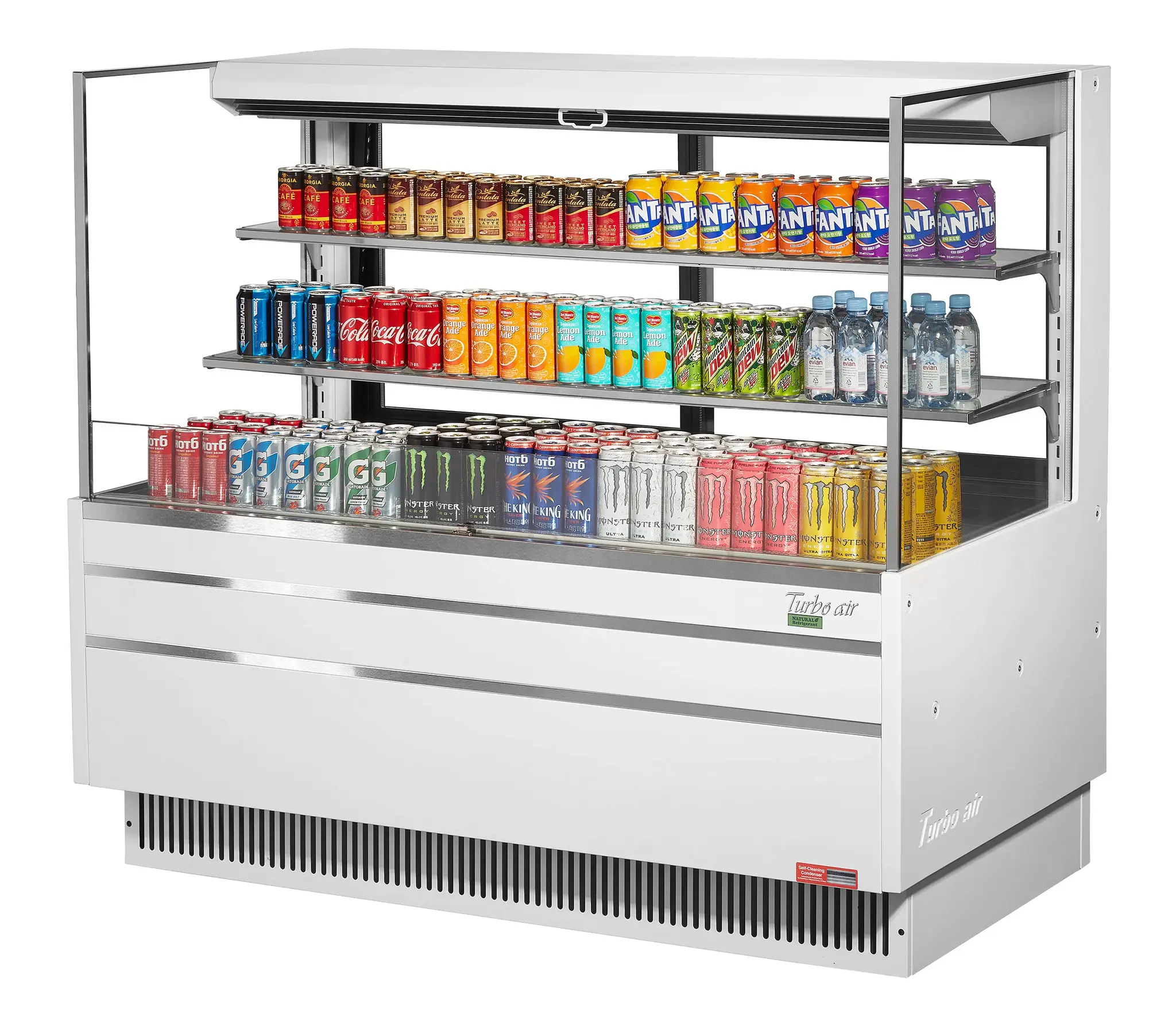 Deliver food perfection with Turbo Air's TOM-60L-UFD-W(B)-3S-N Open Display Case. This sleek and modern display case is designed to enhance impulse sales in a commercial restaurant setting. With its low profile and glass side panels, customers can easily see and access the delicious food on display. The self-cleaning condenser and hydrocarbon refrigerants ensure optimal performance and energy efficiency. The open top and perforated glass doors improve airflow, keeping the food fresh for longer periods. The LED interior lighting illuminates the products, making them even more enticing to customers. The sliding rear door allows for easy loading and unloading of products. Plus, the energy-saving night curtain helps conserve energy during non-business hours. With a bottom stainless steel solid shelf and two glass shelves, there is plenty of space to showcase a variety of food items. Choose between white and black color options to match your restaurant's aesthetic. Trust Turbo Air's TOM-60L-UFD-W(B)-3S-N Open Display Case to elevate your restaurant's food presentation and boost sales.