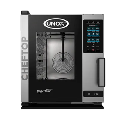 Unleash your inner chef with the Unox XACC-0513-EPRM Combi Oven. This compact electric countertop oven is a game-changer for commercial restaurants. With a capacity of (5) 1/1 GN or (5) 12"x20" hotel pans, it can handle all your cooking needs. The MIND.Maps technology and programmable menu allow for precise control and customization of cooking processes, ensuring consistent and delicious results every time. The 2-5/8" shelf spacing provides flexibility for cooking multiple dishes simultaneously. The glass door and stainless steel interior and exterior not only add a sleek and professional look to your kitchen but also make cleaning a breeze. With a power range of 5.8-7.7 kW, this oven is energy-efficient and NSF and cMETus certified. It even has the prestigious ENERGY STAR rating. Elevate your culinary creations with the Unox XACC-0513-EPRM Combi Oven.