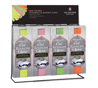Upgrade Your Culinary Instrument with the Victorinox Swiss Army V0000855 Cut Resistant Glove. Designed for commercial restaurant use, this glove is a must-have for any professional chef or kitchen staff. With its high-performance fit and cut-resistant material, it provides optimal protection against accidental cuts and abrasions while ensuring maximum dexterity and flexibility. The glove comes in a convenient display set, including a 4-peg wire rack and 32 gloves in vibrant colors (8 green, 8 orange, 8 pink, and 8 yellow). The eye-catching header card adds a professional touch to your restaurant's kitchen. Made by Victorinox Swiss Army, a trusted name in culinary tools, this glove is packed with quality and durability. Upgrade your kitchen safety measures and enhance your culinary experience with the Victorinox Swiss Army Cut Resistant Glove.