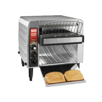 Unleash gastronomic brilliance with the Waring CTS1000B Toaster, Conveyor Type. This commercial conveyor toasting system is designed to meet the demands of a busy restaurant kitchen. With its horizontal conveyor and 2" opening, it can toast up to 1,000 slices per hour, ensuring that your customers never have to wait long for their perfectly toasted bread. The brushed stainless steel construction not only gives it a sleek and professional look but also ensures durability and easy cleaning. The cool-touch side panels provide added safety, allowing your staff to handle the toaster without the risk of burns. The speed control and energy-saving standby functions help you optimize energy usage, saving you money in the long run. With a quick 4-minute heat-up time, this toaster is ready to go whenever you need it. Trust Waring, a reputable vendor in the industry, and elevate your restaurant's toasting game with the CTS1000B Toaster, Conveyor Type.