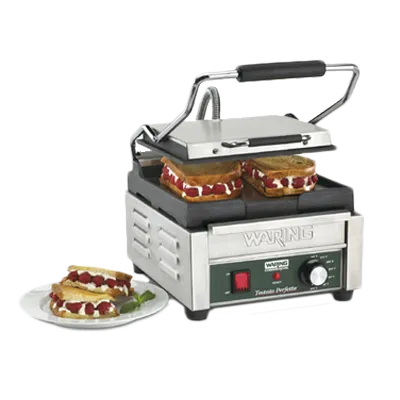 Serve with pride with the Waring WFG150T Sandwich/Panini Grill. This compact and flat toasting grill is a must-have for any commercial restaurant. With its timer and 120v/60/1-ph power supply, this grill is designed to deliver perfect toasts every time. The WFG150T is packed with features that make it ideal for busy restaurant kitchens. Its compact size allows for easy placement on countertops, saving valuable space. The timer ensures precise cooking, allowing chefs to multitask without worrying about overcooking. The grill's sturdy construction and high-quality materials guarantee durability and long-lasting performance. Whether you're making delicious paninis or toasting sandwiches, the Waring WFG150T is the perfect tool to elevate your restaurant's menu. Don't settle for anything less than the best. Choose the Waring WFG150T Sandwich/Panini Grill and serve your customers with pride.