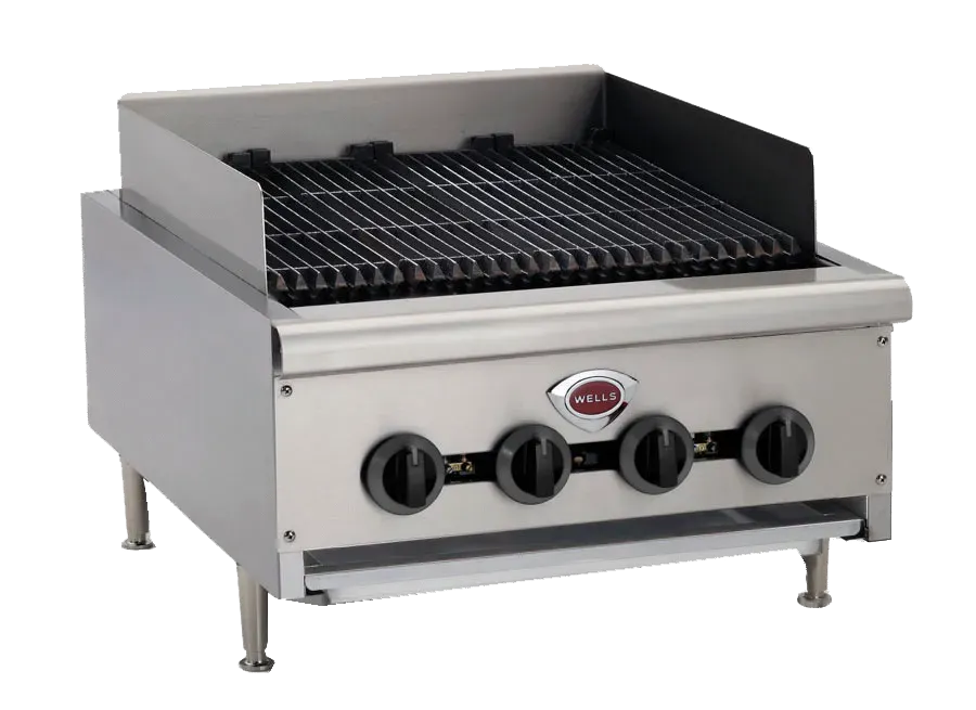 Wells HDCB-2430G Gas Countertop Charbroiler features extra heavy-duty cast iron burners, cast-iron radiants, and reversible cast-iron grates for higher heat, consistent temperatures, and quicker recovery. Each burner features operator adjustable infinite heat adjustment and On/Off control and adjustable air shutter to control air and optimize combustion. Stainless-steel side panels and splash guard, removable drip pan for ease of clean-up and adjustable 4" heavy-duty steel legs. Ships in natural gas and are field convertible to LP Gas. 24"W x 30"D cooking surface, 80K BTU, and 4 burners.