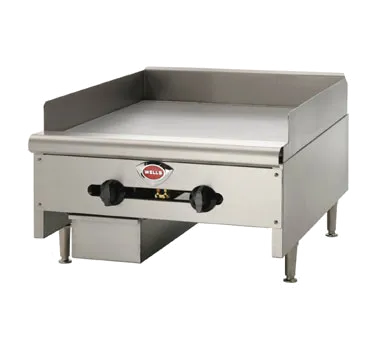 Equip your kitchen for success with the Wells HDG-2430G Gas Countertop Griddle. This high-quality griddle is designed to meet the demands of a commercial restaurant kitchen. With a 23" wide by 23-9/16" deep cooking surface and a 3/4" griddle plate, it provides ample space for cooking a variety of foods. The griddle features two manual controls, allowing for precise temperature adjustments and ensuring even cooking. The stainless steel housing and grease drawer make it easy to clean and maintain, while the splashguard helps to prevent any messes. With 60,000 BTUs of power, this griddle delivers fast and efficient cooking results. It is NSF and cULus certified, guaranteeing its safety and quality. Whether you're cooking breakfast, lunch, or dinner, the Wells HDG-2430G Gas Countertop Griddle is the perfect addition to any commercial kitchen.