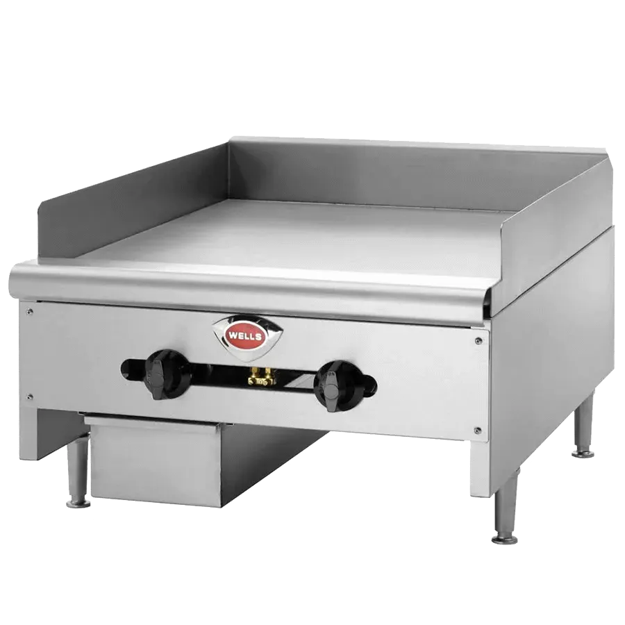 Wells HDG-3630G Countertop Gas Griddle is extra heavy-duty and features a 3/4" griddle plate for quick pre-heat, even heat distribution, and fast recovery. Each control features an adjustable air shutter to control air and optimize combustion. Removable stainless-steel front panel, stainless-steel side panels and splash guard, full-width, front mounted grease trough, removable large capacity drip pan for ease of clean-up and adjustable 4" heavy-duty steel legs. Ships in natural gas and are field convertible to LP Gas. Manual Controls, 36"W x 23.75"D cooking surface, and 90K BTU