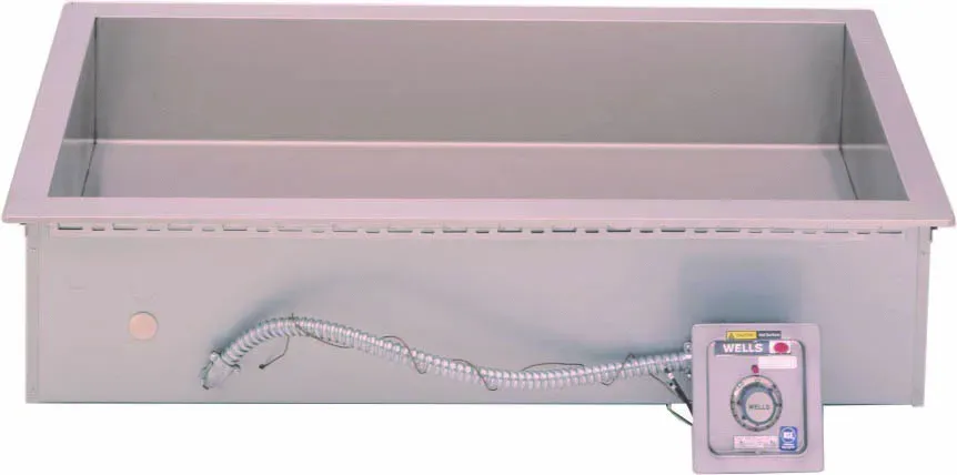 Wells HT-500 Bain Marie Style electric top-mount, drop-in food warmers are designed to hold heated foods at safe and fresh serving temperatures. This single-opening, heated tank provides consistent temperature and can accommodate a variety of round or rectangular inset pans. Drain and WellsLok are standard. Designed for wet operation only, is fully insulated, and thermostat controls. Five 12" x 20" Pans, Standard Opening 25 3/4" x 19 7/8", 208/240V