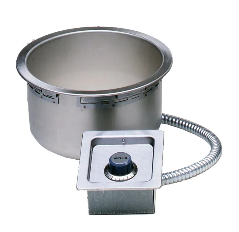 Wells SS-10TD heavy-duty, top-mount, drop-in round food warmer is designed to hold heated foods at safe and fresh serving temperatures. Accommodates standard 11 quart round inset pans, one-piece stainless steel top flange and heavy-gauge, deep-drawn stainless steel warming pans. Temperature-ready indicator lights and powerful tubular heating elements are located under the warming pans for quick and efficient heating and for even heat distribution. High limits prevent overheating, and Wellsloks for quick and easy installation are standard features. Thermostatic Control, Drain, Non-Insulated, 120V