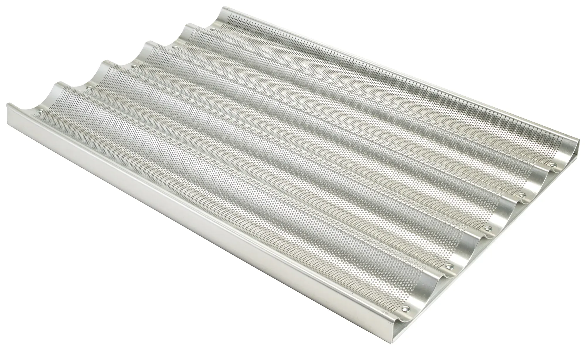 Elevate culinary tools with the Winco Baguette Pan, a must-have for any restaurant aiming to perfect its bread offerings. This high-quality pan features 5 slots, each designed to produce perfectly shaped baguettes, ensuring consistency and excellence in every bake. Measuring 18x26x1 inches overall, this pan fits seamlessly into standard commercial ovens, making it an ideal choice for busy kitchens. Crafted from 16 gauge aluminum, the Winco Baguette Pan is both durable and lightweight, providing long-lasting performance without compromising on ease of use. The silicon glaze coating enhances its non-stick properties, allowing for effortless release of baked goods and simplifying the cleaning process. This feature is particularly beneficial in a fast-paced restaurant environment where efficiency is key. The model ABPN-5 is specifically engineered to meet the demands of professional bakers, offering reliability and superior results with every use. Its robust construction ensures even heat distribution, which is crucial for achieving the perfect crust and texture that customers expect from high-quality baguettes. Incorporating the Winco Baguette Pan into your kitchen arsenal not only elevates the quality of your baked goods but also streamlines your baking process. Its thoughtful design and premium materials make it an indispensable tool for any restaurant committed to delivering exceptional bread to its patrons. Choose the Winco Baguette Pan and experience the difference in your baking outcomes, ensuring your restaurant stands out with every loaf.