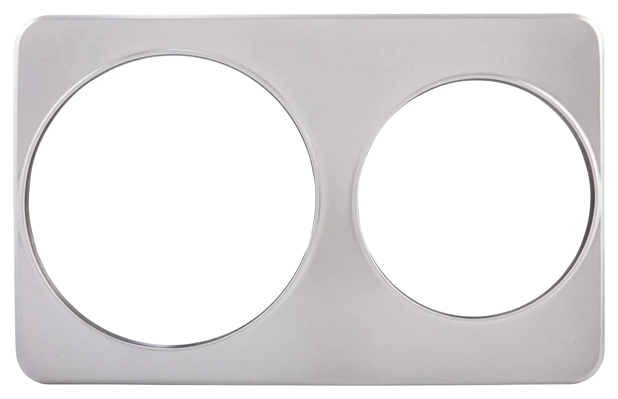 Create with confidence using the Winco Adapter Plate, a versatile and essential addition to any professional kitchen. Designed with precision, this adapter plate measures 21 inches wide by 13 inches deep, making it a perfect fit for various kitchen setups. The plate features two strategically placed holes: one 8-3/8 inch hole and one 10-3/8 inch hole, accommodating both 7-quart and 11-quart insets seamlessly. Crafted from high-quality stainless steel, the Winco Adapter Plate ensures durability and longevity, standing up to the rigorous demands of a busy restaurant environment. Its robust construction not only provides a stable base for your insets but also ensures easy cleaning and maintenance, essential for maintaining hygiene standards in your kitchen. The model ADP-810 is specifically designed to enhance the efficiency of your kitchen operations. By securely holding your insets in place, it allows for smooth and efficient food preparation and service, minimizing the risk of spills and accidents. This makes it an invaluable tool for chefs and kitchen staff who prioritize both safety and efficiency. Whether you are serving soups, stews, or sauces, the Winco Adapter Plate ensures that your insets are held securely, allowing you to focus on creating culinary masterpieces. Its sleek design and practical functionality make it a must-have for any restaurant looking to optimize their kitchen workflow. Invest in the Winco Adapter Plate today and experience the perfect blend of quality, functionality, and durability. Enhance your kitchen's efficiency and create with confidence, knowing that you have a reliable tool at your disposal.