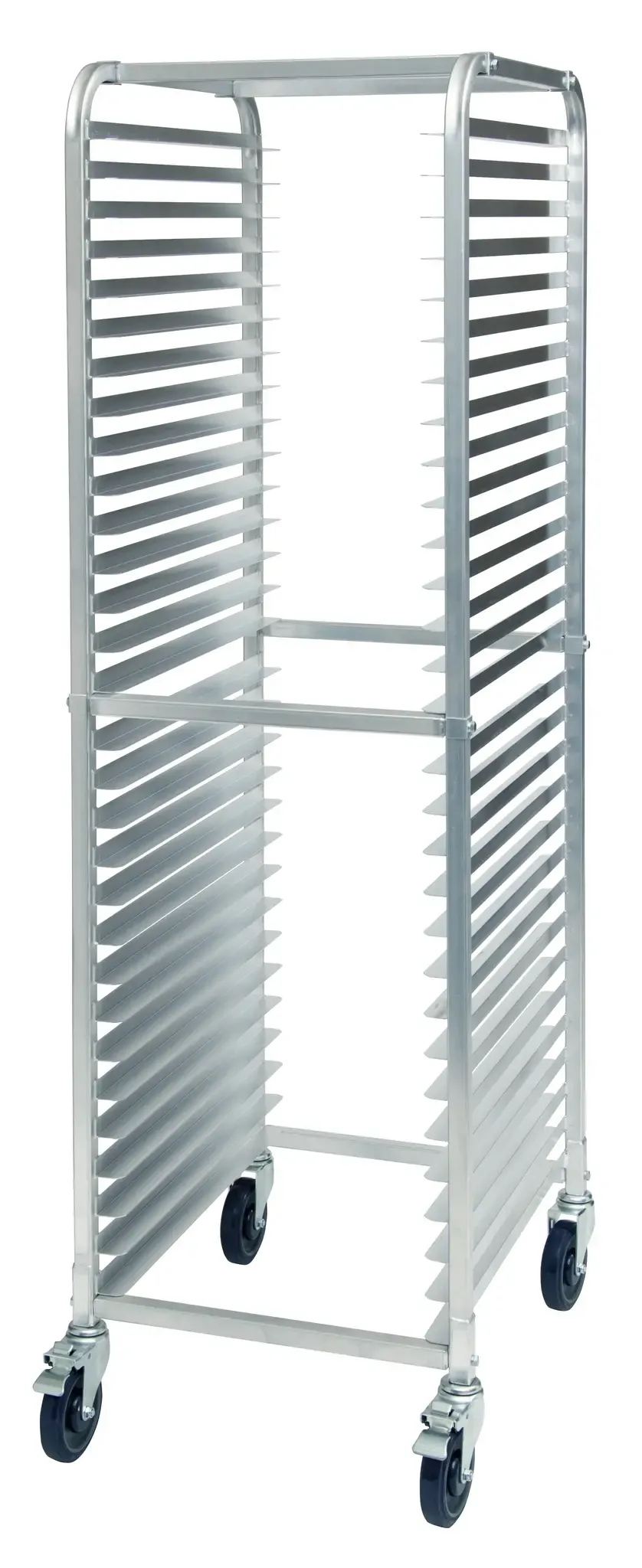 Engineered for excellence using top-tier materials, the Winco Sheet Pan Rack is an indispensable asset for any bustling restaurant kitchen. Designed to accommodate up to 30 full-size (18 x 26) or 60 half-size (18 x 13) sheet pans, this mobile rack boasts a robust 700 lb. capacity, ensuring it can handle even the heaviest of loads with ease. Crafted from durable aluminum, the Winco Sheet Pan Rack is built to withstand the rigors of a high-volume kitchen environment. The 2-inch runner spacing provides ample room for efficient storage and retrieval of pans, streamlining your kitchen operations. The rack is equipped with four 5-inch heavy-weight swivel casters, two of which feature brakes, offering both mobility and stability as needed. The NSF certification of the Winco Sheet Pan Rack guarantees that it meets the highest standards for public health protection, making it a reliable choice for maintaining hygiene and safety in your kitchen. The knock-down (KD) design allows for easy assembly and disassembly, facilitating convenient storage and transport when not in use. Whether you are baking, cooling, or storing, the Winco Sheet Pan Rack (Model: ALRK-30BK) is a versatile and practical solution that enhances efficiency and organization in your restaurant. Invest in this high-quality rack to optimize your kitchen workflow and ensure your culinary creations are always within reach.