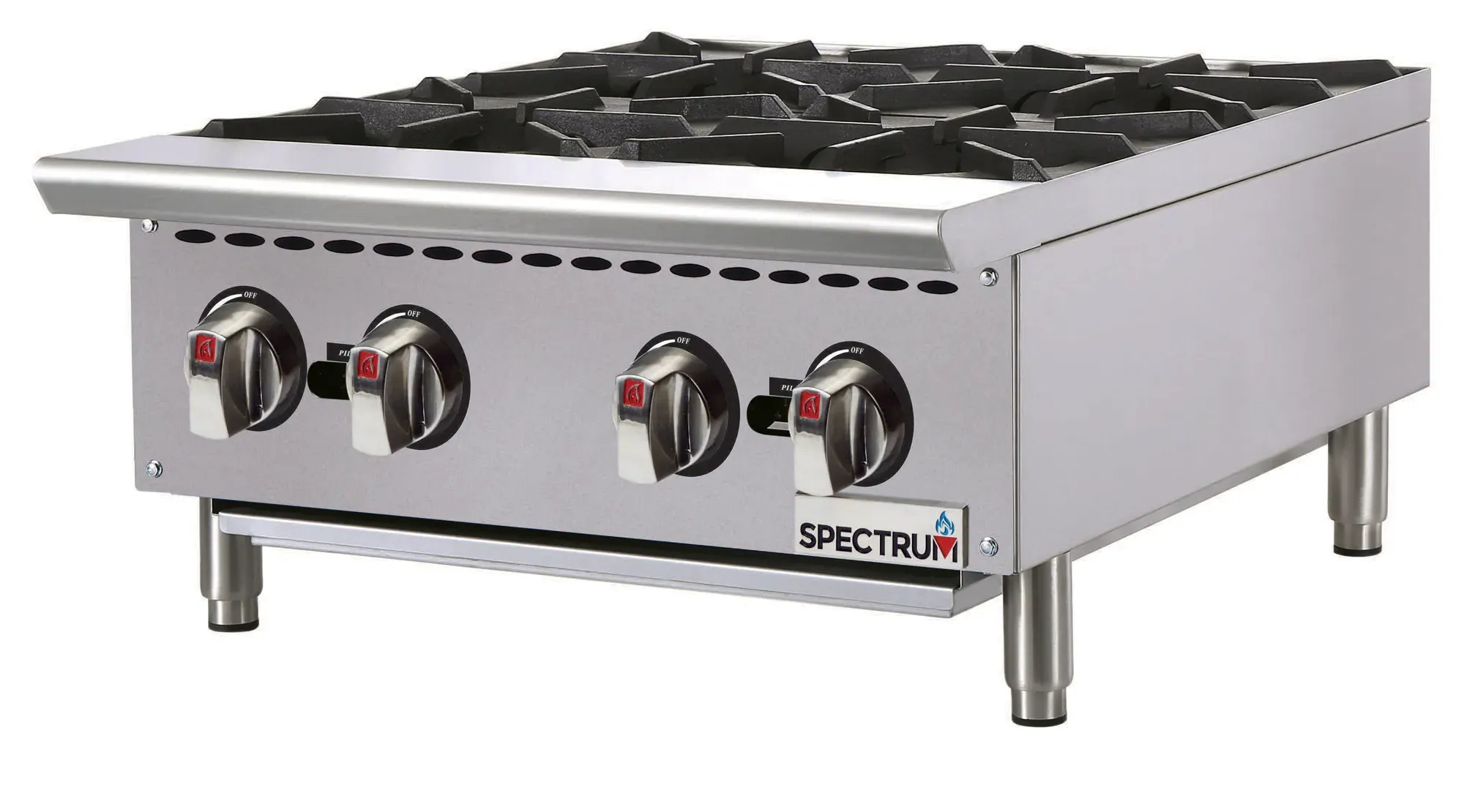 Enhance the kitchen's capabilities with the Winco Spectrum Hotplate. This high-performance natural gas countertop hotplate is designed to meet the rigorous demands of a busy restaurant environment. Featuring four powerful 25,000 BTU open burners, the Spectrum Hotplate ensures rapid and efficient cooking, making it an indispensable asset for any culinary operation.