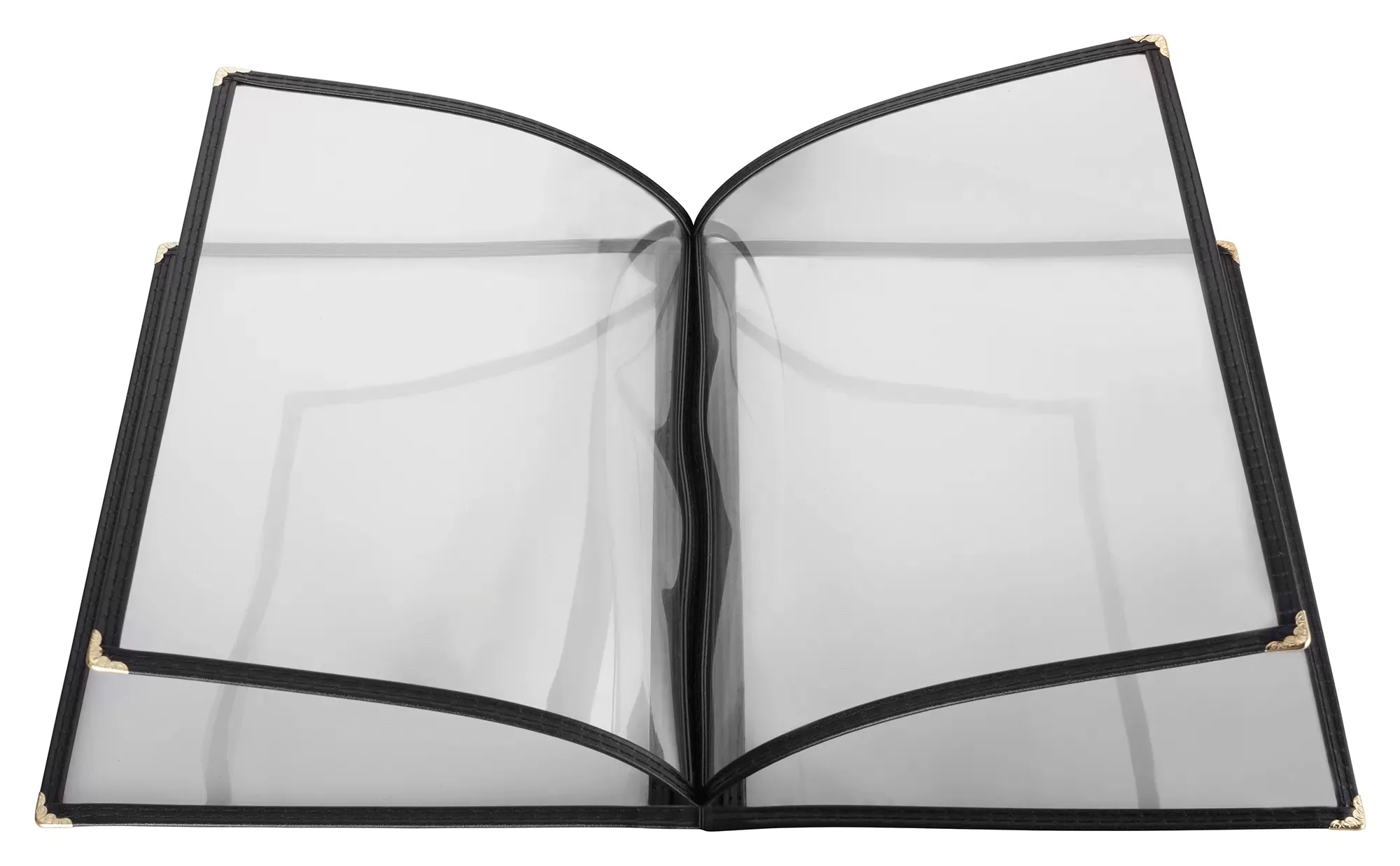 Master every recipe with the Winco Menu Cover, a must-have for any restaurant looking to present its menu with style and durability. This four-page menu cover, model PMCF-9K, is designed to hold 8-1/2 x 11-inch paper, making it perfect for showcasing your culinary offerings in a professional and organized manner.