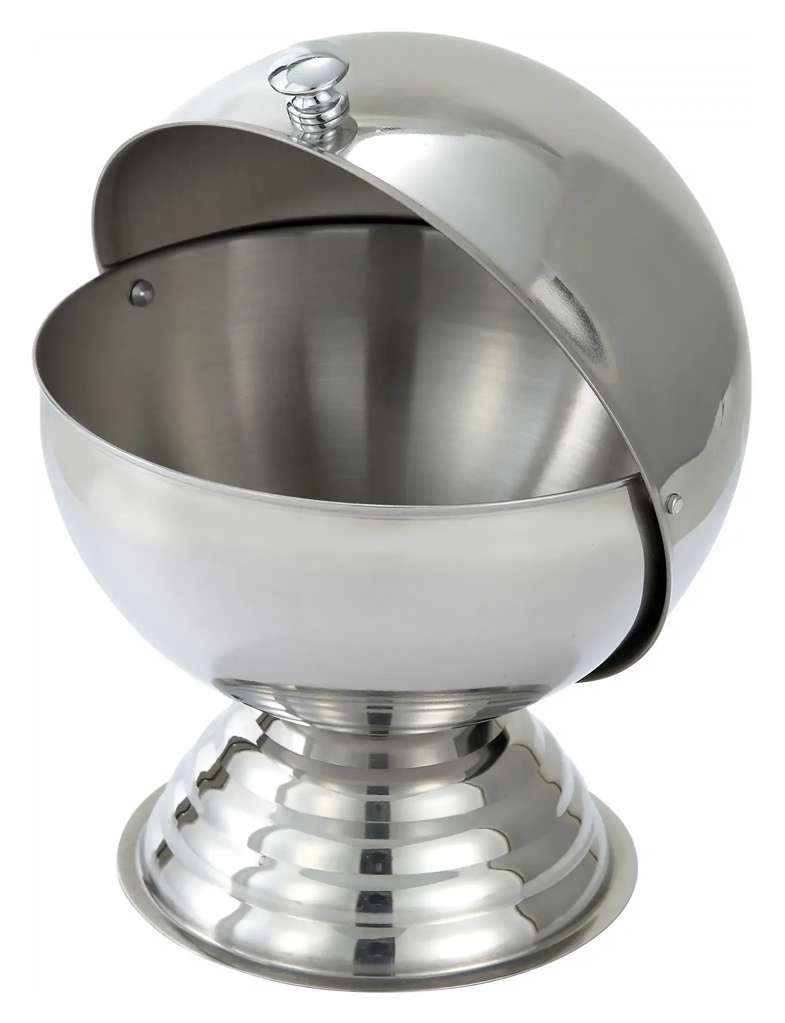 Perfect for everyday use in any restaurant setting, the Winco Sugar Bowl is an essential addition to your dining experience. This 20 oz. round footed sugar bowl, model SBR-30, is crafted from high-quality stainless steel, ensuring durability and a sleek, professional appearance. The roll top lid design not only adds a touch of elegance but also provides easy access to sugar while keeping it fresh and protected from contaminants.