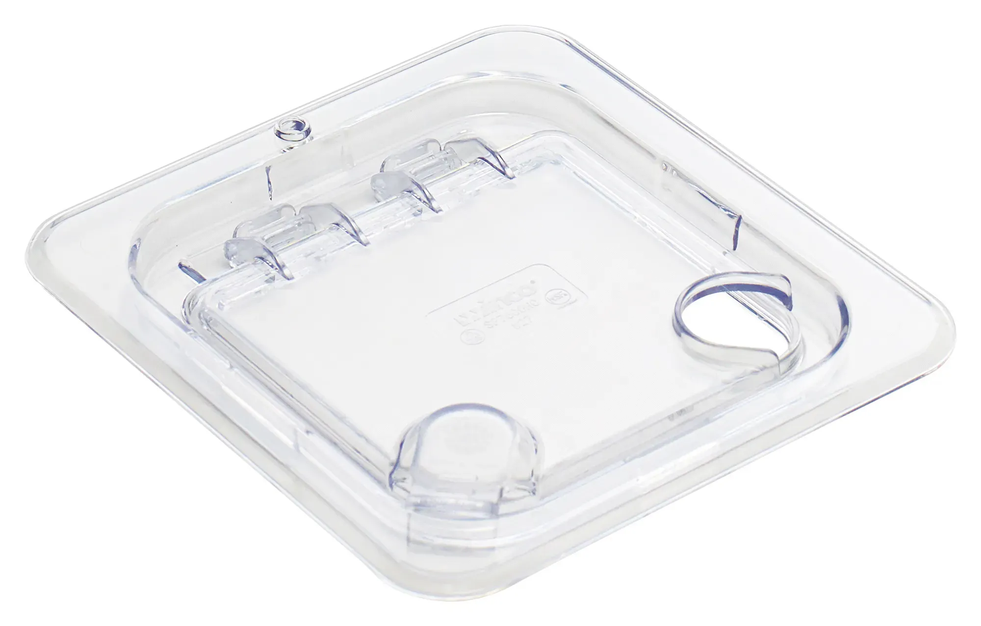 Safely store food, with this polycarbonate hinged lid. Featuring a built-in spoon notch, this lid enables your staff to keep spoons inside the pan during times of storage, further minimizing the risk of cross-contamination. Made of durable polycarbonate Hinged design helps prevent cross-contamination Convenient notched design ensures easy access to serving spoons Stain-, break-, and chip-resistant for long-lasting use Large slotted opening for spoon or ladle
